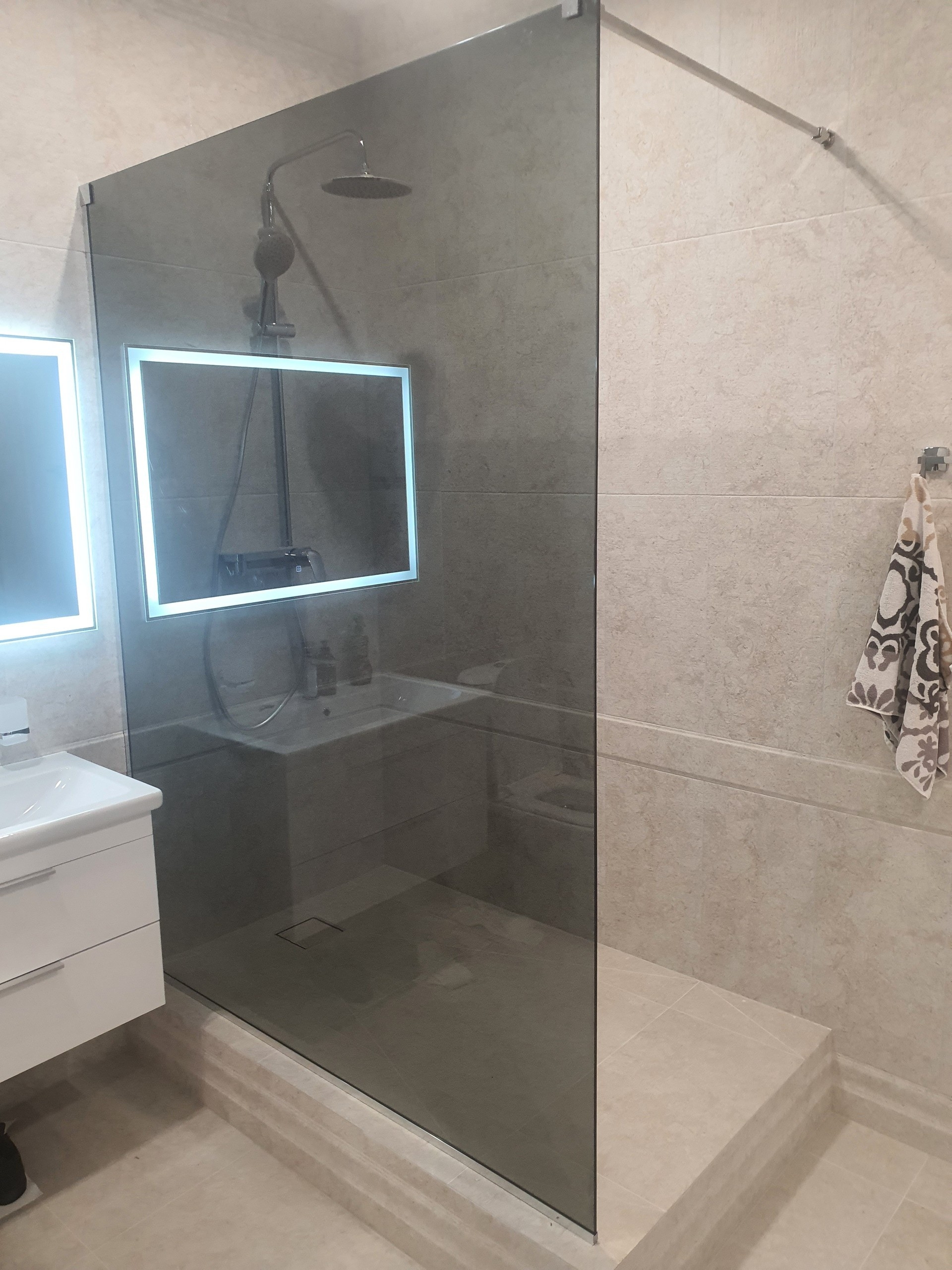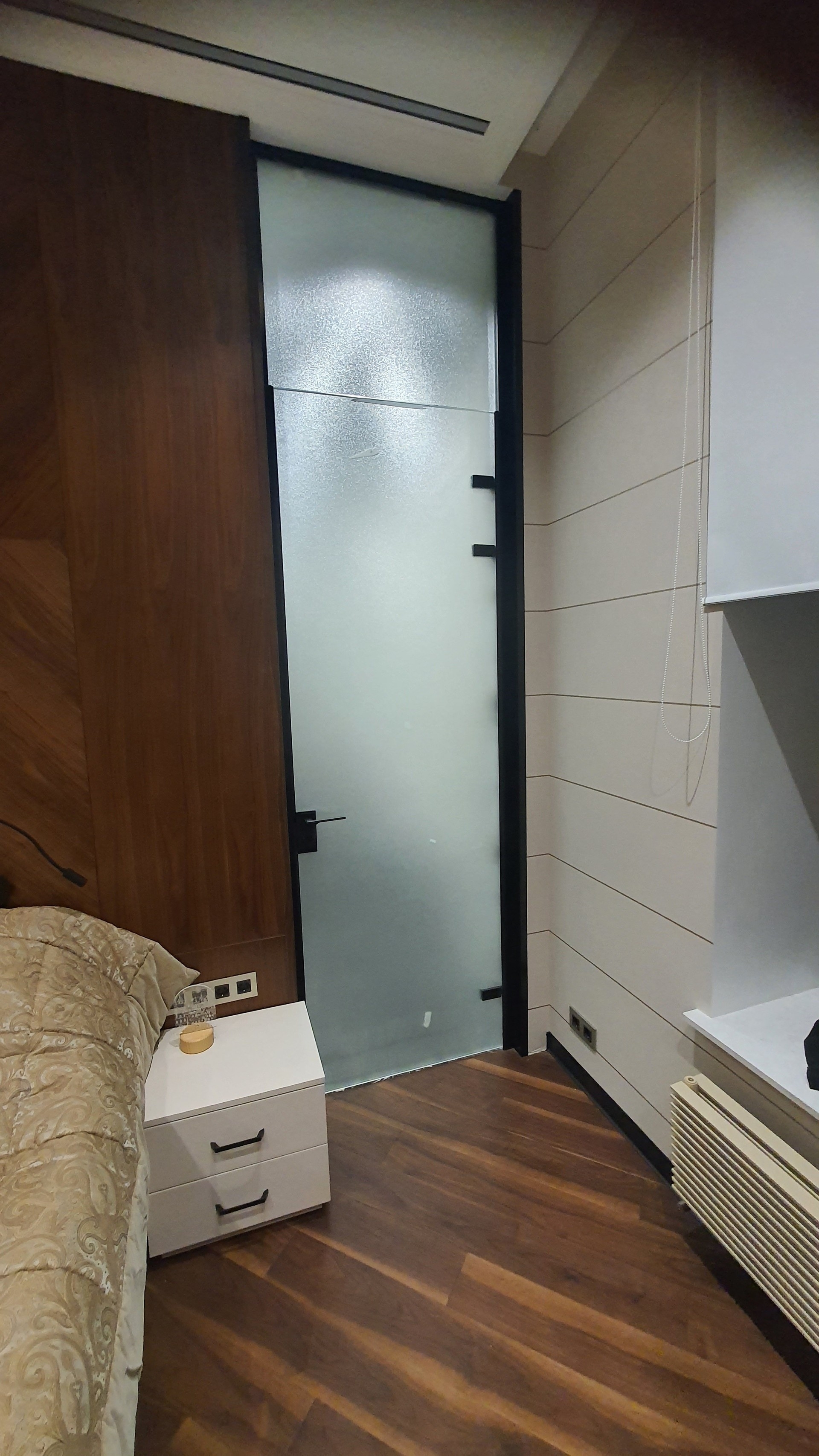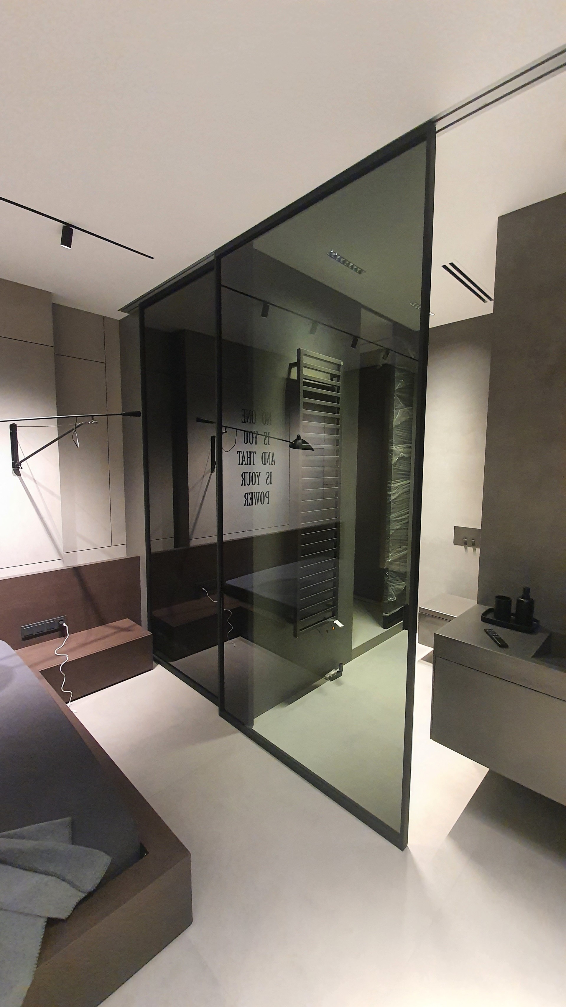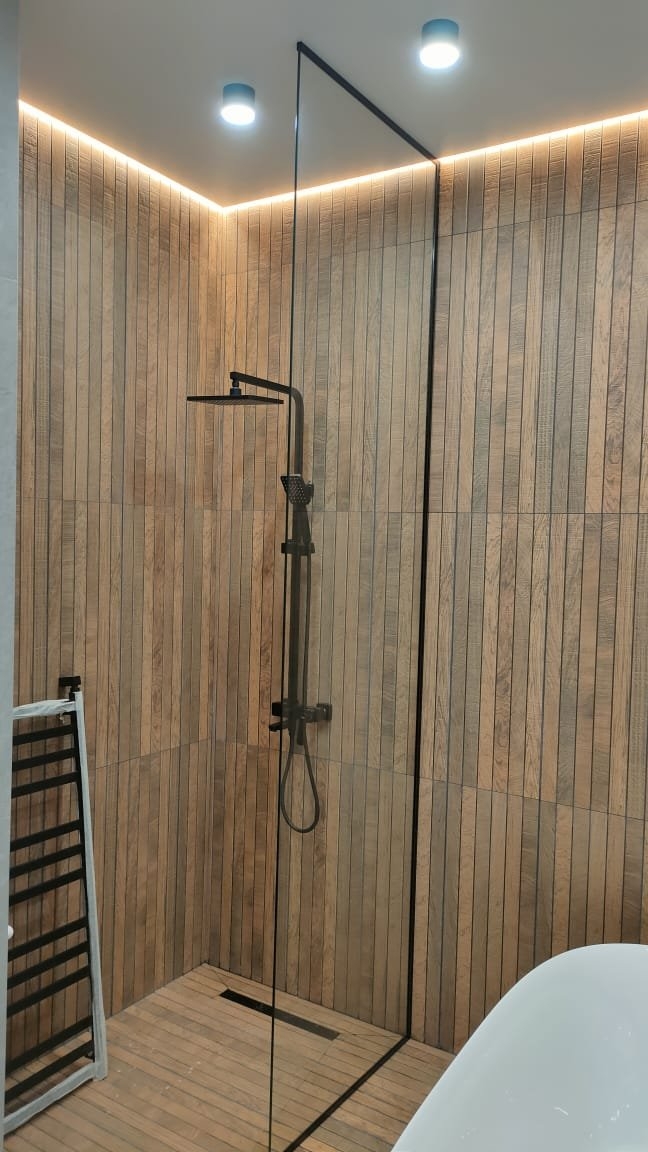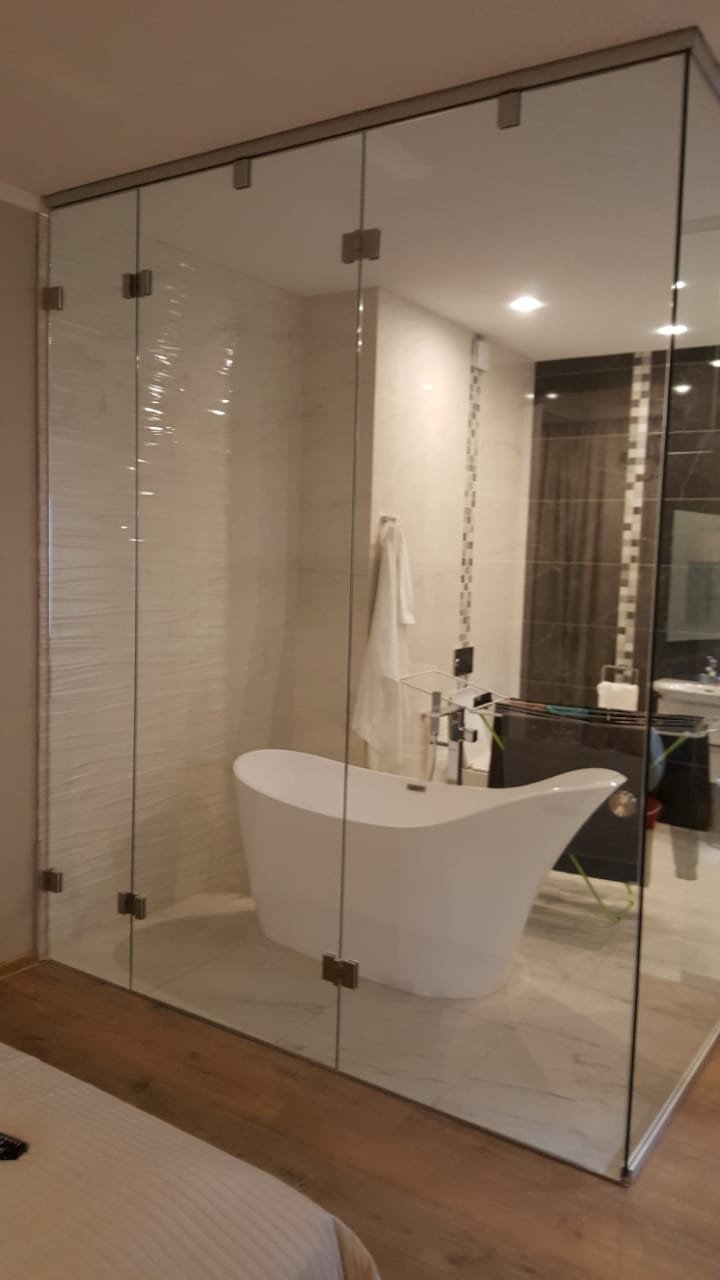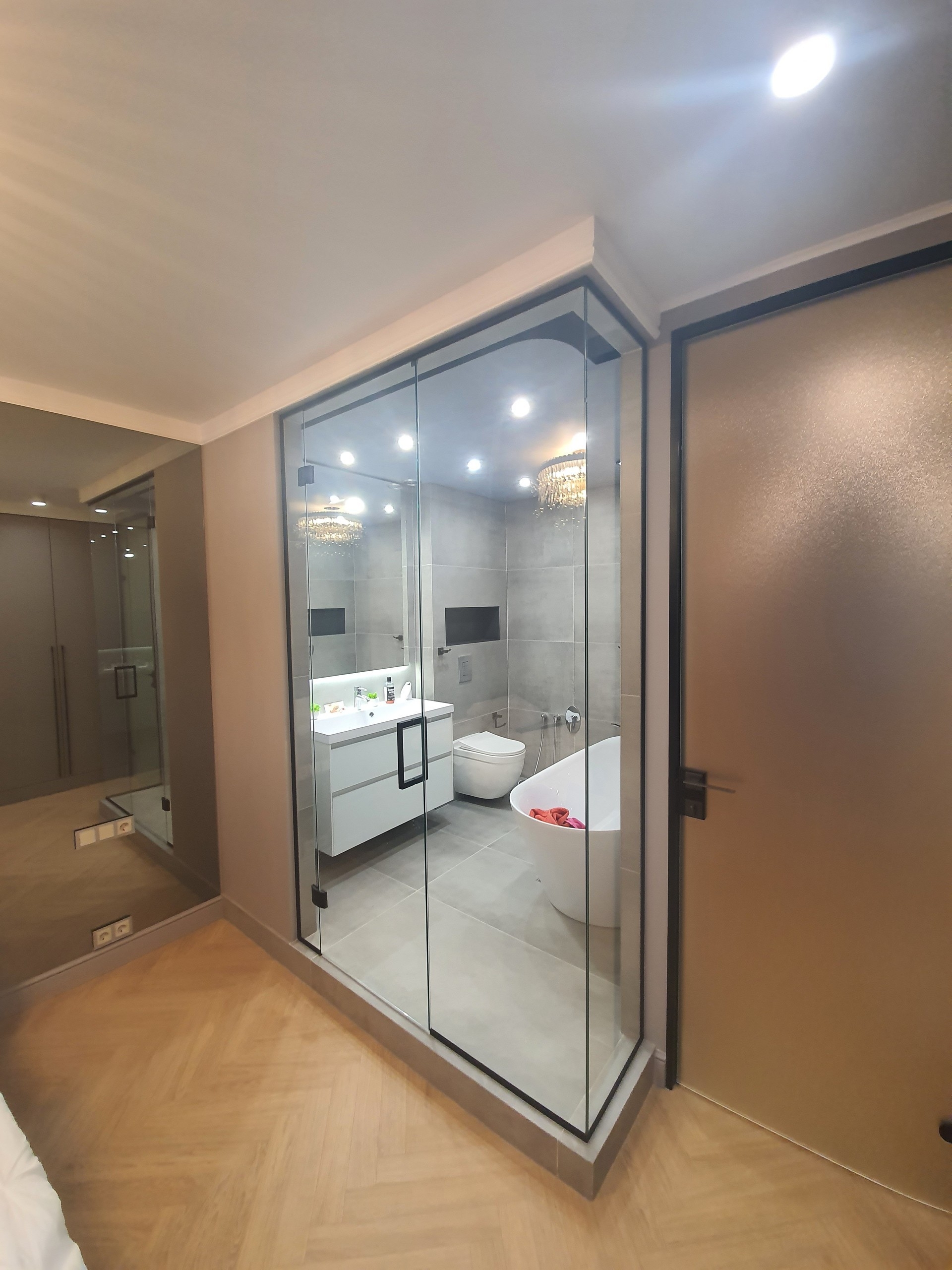 Эффективное зонирование, которое сохраняет свет и визуально расширяет пространство. Надёжные зеркальные перегородки из закалённого стекла для вашего комфорта и стиля.